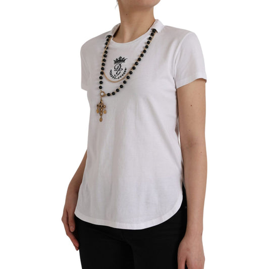 Dolce & Gabbana White Cotton Necklace Embellished T-shirt