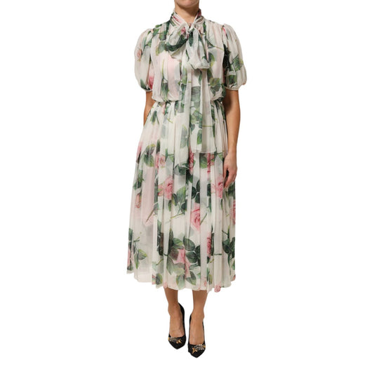 Dolce & Gabbana White Floral Print Silk Pleated Midi Dress
