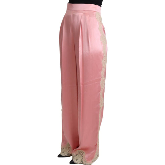 Dolce & Gabbana Pink Lace Trimmed Silk Satin Wide Legs Pants